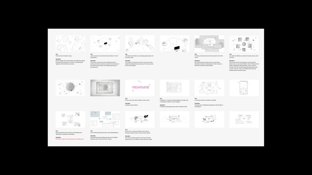 After that, Galera delivered a storyboard where ideas and details were fine-tuned and adjusted, taking feedback and input from the Frontastic team. Snippets of the animation work were sent routinely for feedback so that Frontastic could get the feel and look for the flow of animation as the process was evolving. When the animation was complete, voice-over and music production were added and finalized.